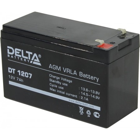 Герметизированный VRLA cвинцово-кислотный аккумулятор Delta DT 1207 напряжением 12В и емкостью 7Ач изготовлен по технологии AGM (с микропористым заполнителем, пропитанным электролитом). Корпус изготовлен из негорючего ABS пластика. Срок службы аккумулятора рассчитан на 3-5 лет работы. Аккумулятор предназначен для работы в режиме постоянного подзаряда (т.н. буферный режим), обладает низким внутренним сопротивлением и саморазрядом.